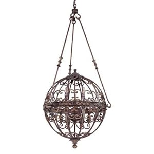Product Description : The La Paloma large wrought iron chandelier features many beautiful touches. This round fixture is adorned with gentle scrolls, detailed finials, and decorated support rods. The hand-worked wrought iron frame comes in a Venetian bronze finish and is illuminated by nine slender candelabra fixtures.