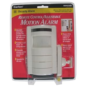 Product Description : From the ManufacturerThe Wireless Motion Detector can be used as a portable alarm or can be wall mounted where the adjustable PIR sensor will detect movement over an area of 30' by 110o. It can be armed/disarmed with the enclosed infrared remote control unit. The chime feature can be used to announce visitors at the entrance of the home or office. Product Description : Carlon HS4370D Remote Control/Adjustable Motion AlarmCarlon HS4370D Remote Control/Adjustable Motion Alarm Features:;No wiring necessary-easy installation;Detects motion up to 30' away;Adjustable sensor head provides 110Degree coverage within 180Degree area;15 second entrance and 45 second exit delays;Continuous alarming while motion detected one minute after no motion detected;Remote control operates up to 25';Carded