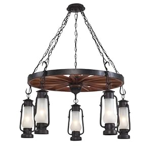 Product Description : From the ManufacturerThis series is reminiscent of the hurricane oil lanterns predominantly used in railroad and nautical applications in the late 1800's. Although powered by electric, the essence of this old world inspired collection remains. The Matte Black finish of the heavy ironwork cleverly contrasts the acid etched blown glass to complete the historic appeal. Product Description : Featuring a rustic style design with five hanging lanterns, this distinctive chandelier is a great way to accent your decor.